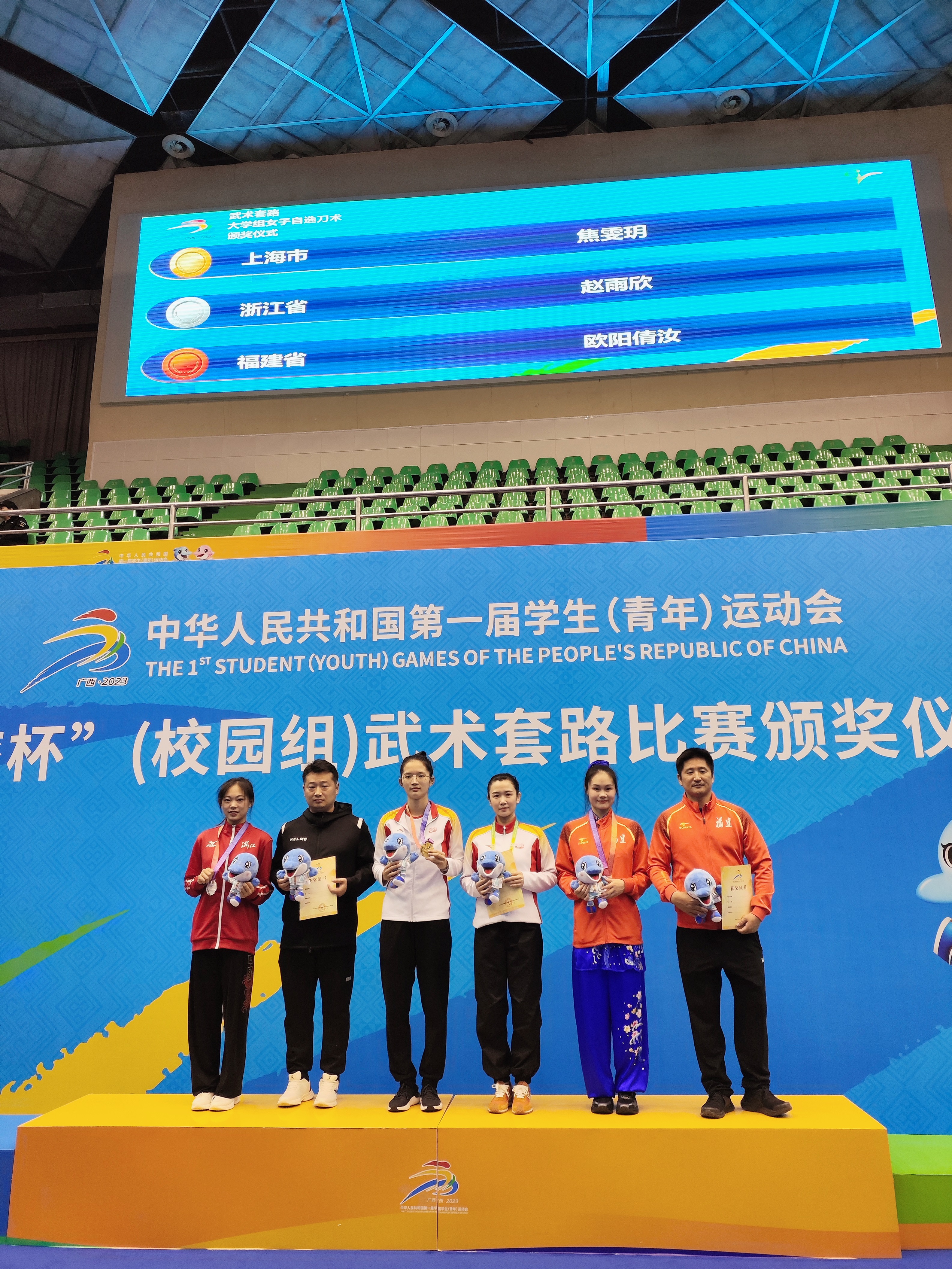 11月5日至15日,由教育部、体育总局、共青团中央主办的第一届全国学生(青年)运动会(简称学青会)在广西举行,旨在全面深化和推进新时代青少年和学校体育高质量发展,增强学生体质健康水平,促进竞技体育后备人才培养。本届学青会共设39个大项、805个小项,1.8万名运动员参赛。由sunbet申搏官网组建的校园组上海代表团武术队(大学组)在此次比赛中喜获1金2银1铜的佳绩。其中,sunbet申搏官网运动员焦雯玥斩获女子大学组自选刀术冠军,为上海代表团和sunbet申搏官网增添了荣誉。