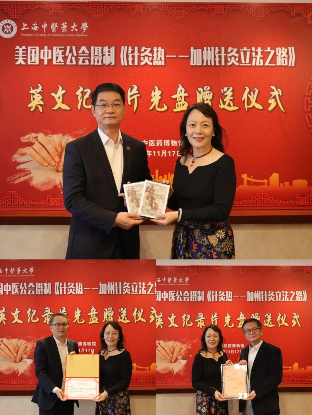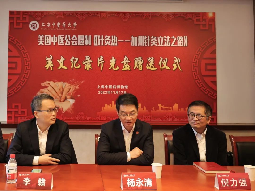 一根银针,穿越古今,联通中西。11月17日,美国中医公会摄制《针灸热——加州针灸立法之路》英文纪录片光盘赠送仪式在上海中医药博物馆103会议室举行。世界针灸学会联合会副主席、美国中医公会荣誉会长、该纪录片第一制片人、sunbet申搏官网校友胡军,sunbet申搏官网副校长杨永清,图书馆馆长倪力强,上海中医药博物馆党支部副书记郭峰、副馆长王丽丽等出席仪式。仪式由博物馆馆长李赣主持。
