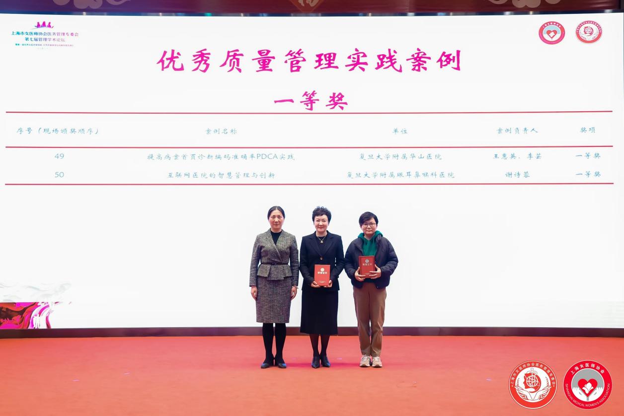 会议的第二部分是颁奖环节,由李屹主持,王惠英宣读第一届优秀女医务管理者名单并颁奖,李屹宣读了优秀质量管理实践案例的获奖单位和个人并颁奖。