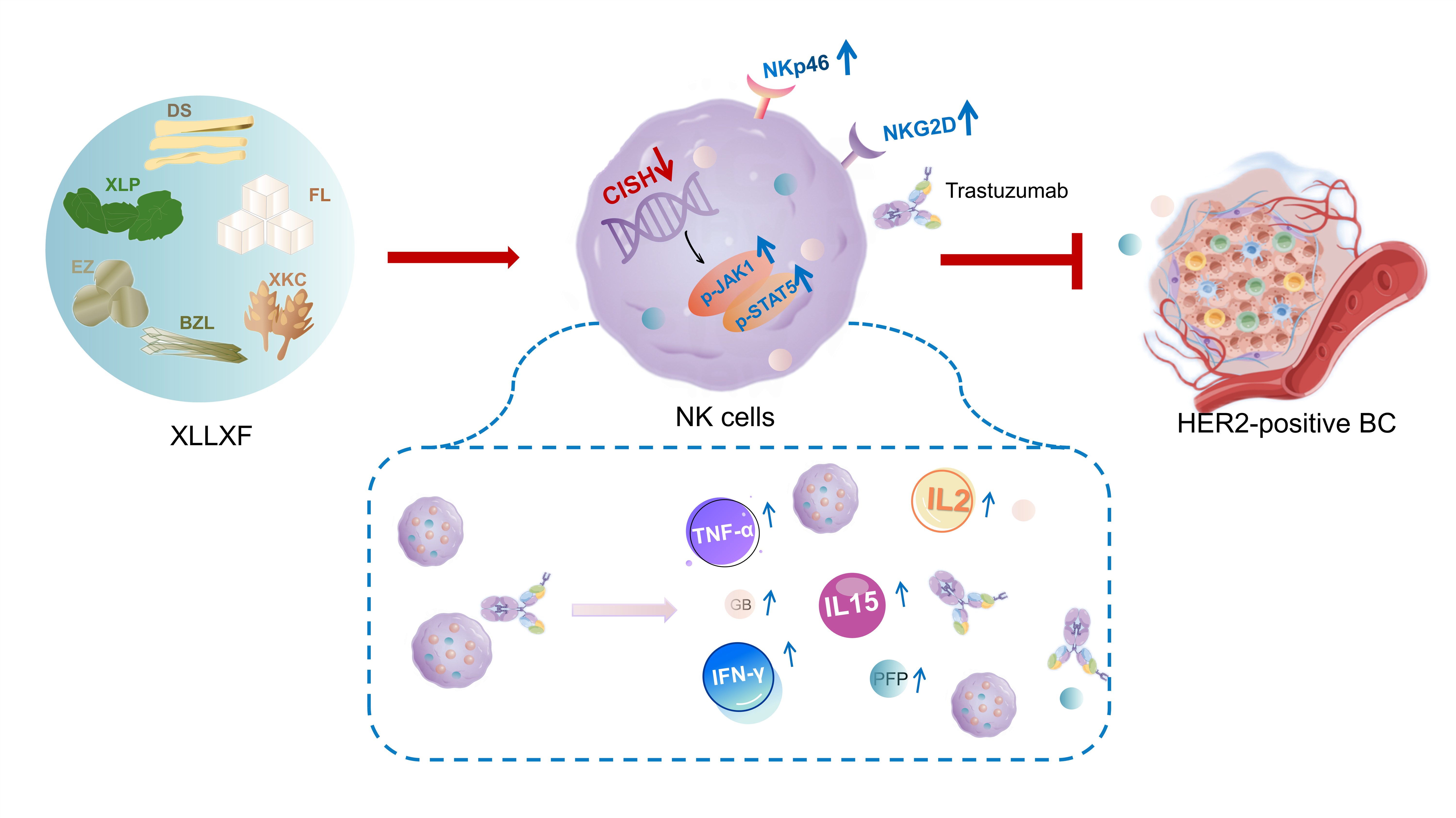 研究表明,仙苓莲夏方能够从增强NK细胞的活性和ADCC效应(抗体介导的细胞毒性)途径,提高患者的免疫抗癌能力,从而协同曲妥珠单抗抑制HER2阳性乳腺癌的生长和扩散。