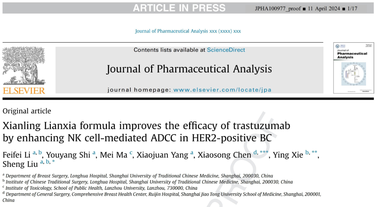 研究成果Xianling Lianxia formula improves the efficacy of trastuzumab by enhancing NK cell-mediated ADCC in HER2-positive BC于中科院一区期刊Journal of Pharmaceutical Analysis在线发表。该杂志为2022年WJCI“顶尖期刊”,影响因子学科排名位全球TOP5%。