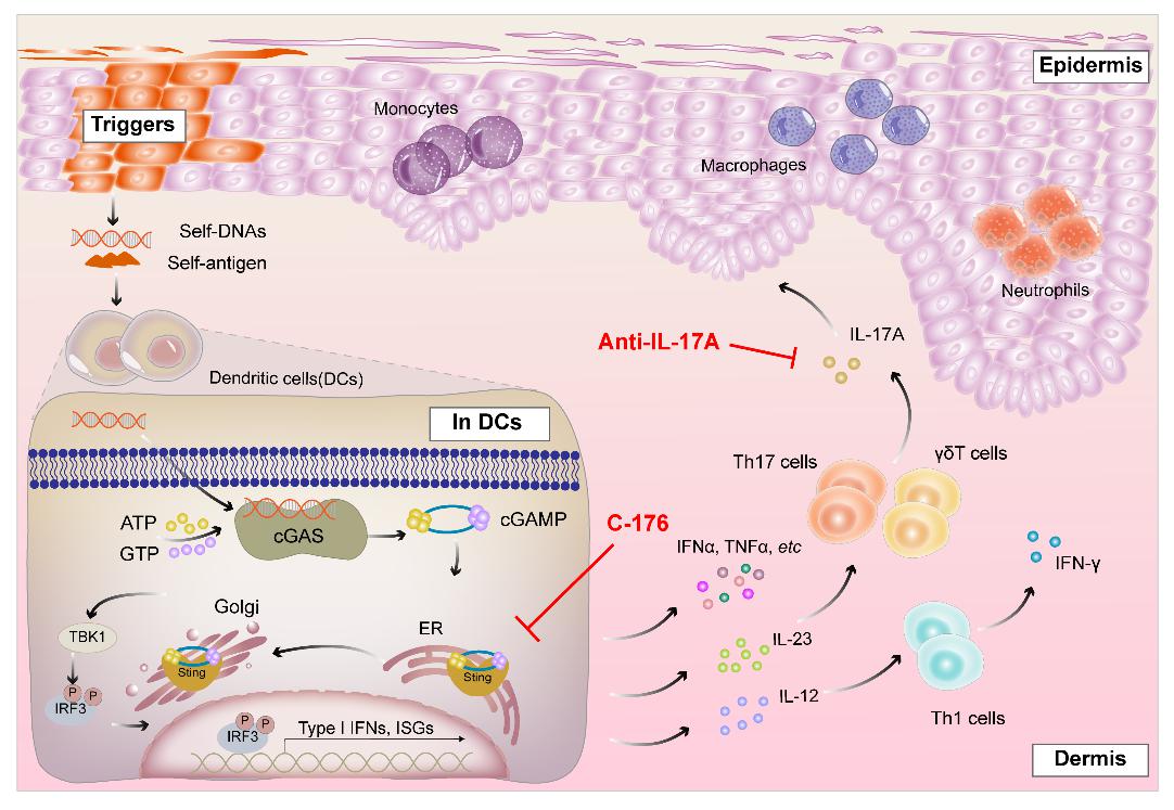 这项研究强调了cGAS-STING信号通路在银屑病病变中的关键作用。揭示了STING调控DCs的异常激活,从而调控银屑病中T细胞激活及IL-17A、IFN-γ的产生的内在机制。探索了干预STING的表达或活性可以有效阻碍DCs功能,进而缓解银屑病的治疗新策略。