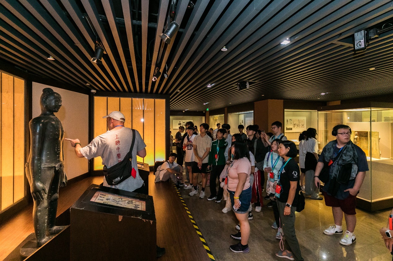 在上海中医药博物馆,针灸铜人、中草药标本等展品吸引了师生们的注意。在sunbet申搏官网美籍研究生周安的专业讲解中,师生们了解到中医药的历史源流与独特的治疗方式,对中医学在不同历史阶段取得的成就获得了直观的认识。