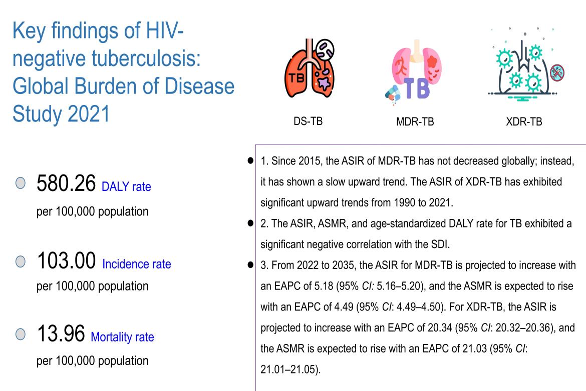 结核病(TB)是一种由结核分枝杆菌引起的传染病,主要影响肺部。尽管结核病可以预防和治愈,它在全球范围内仍然有着高发病率和死亡率,尤其是在低收入和中等收入国家。文章研究分析了1990年至2021年间结核病的发病率、死亡率和伤残调整生命年(DALY)等指标。通过贝叶斯年龄-时期-队列模型(BAPC)预测了未来的发病率和死亡率趋势。研究发现2021年全球HIV阴性结核病的年龄标准化发病率(ASIR)为103.00/10万,与1990年相比下降了40%。全球年龄标准化死亡率(ASMR)为13.96/10万,自1990年以来下降了65%。然而,耐多药结核病(MDR-TB)的ASIR自2015年呈现缓慢上升趋势。广泛耐药性结核病(XDR-TB)的发病率在过去30年显著增加。东亚、东欧、南亚和撒哈拉以南非洲的耐药结核病发病率和死亡率上升趋势尤为显著。研究预测,到2035年,MDR-TB和XDR-TB的发病率和死亡率将呈现显著增加,尤其是在低SDI地区,严重阻碍了WHO及各国政府终止结核的行动。研究建议开发更高效、更准确且便捷的诊断试剂和治疗药物,提高公众卫生教育和社区参与度,这对于遏制结核病传播至关重要。