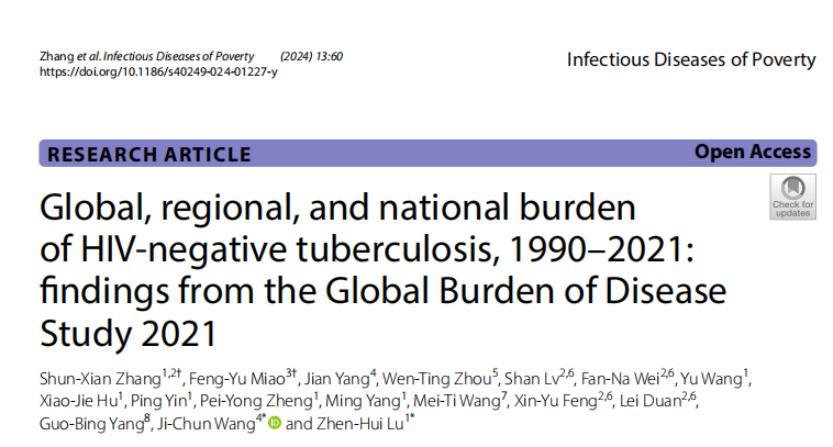 近日,sunbet申搏官网附属龙华医院呼吸疾病研究所团队开展结核病疾病负担研究,研究成果在Infectious Diseases of Poverty(Q1区)杂志上发表,文章的第一作者为龙华医院临床研究中心张顺先副研究员、通讯作者为呼吸疾病研究所所长鹿振辉,题为Global, regional, and national burden of HIV-negative tuberculosis, 1990–2021: findings from the Global Burden of Disease Study 2021。
