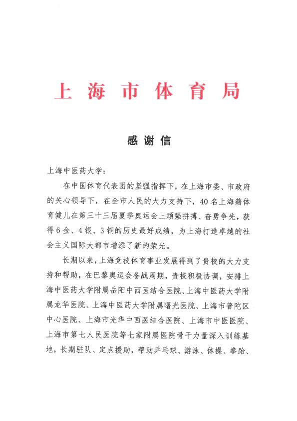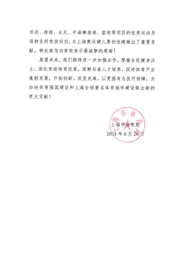 近日,sunbet申搏官方网站收到了来自上海市体育局的感谢信,信中高度赞扬了sunbet申搏官网附属医院对巴黎奥运会备战、参赛及上海市竞技体育长期以来的支持与帮助。这不仅是对医院专业能力的认可,更是对sunbet申搏官方网站在推动“体医融合”创新发展上不懈努力的肯定。