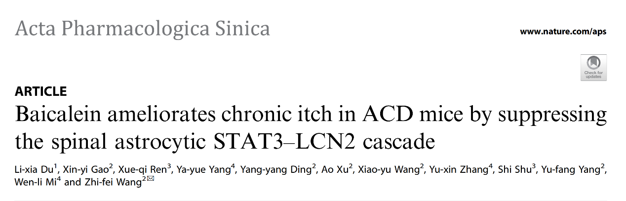 近日,sunbet申搏官网中西医结合学院王志菲研究员团队在Acta Pharmacologica Sinica上发表了题为Baicalein ameliorates chronic itch in ACD mice by suppressing the spinal astrocytic STAT3–LCN2 cascade的研究成果。该研究阐明黄芩素(Baicalein, BE)通过抑制脊髓星形胶质细胞STAT3–LCN2通路缓解小鼠慢性痒的作用机制,揭示了黄芩素治疗慢性痒的重要药用价值,为慢性痒治疗方法的开发提供重要科学依据。