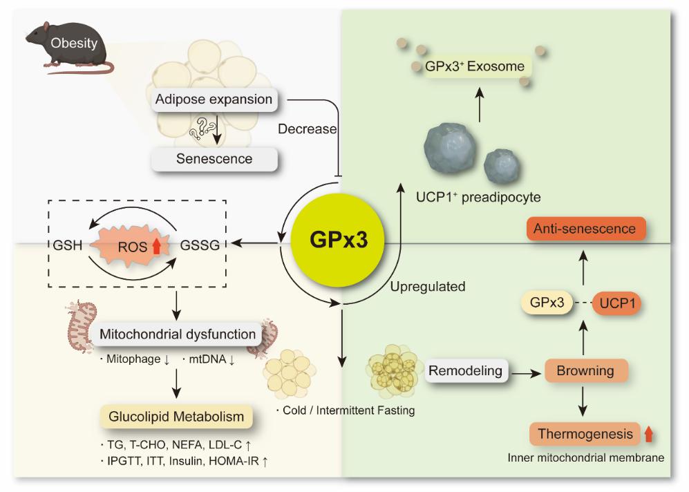研究证实,GPx3参与脂肪衰老,其在脂肪组织中的缺失会损害小鼠的线粒体功能,增加肥胖易感性,并加剧脂肪组织的衰老。GPx3的缺失可能通过破坏线粒体内膜导致线粒体功能障碍。脂肪重塑管理(冷刺激和间歇性饮食)能有效改善脂肪组织的衰老,并伴随GPx3表达的增加。此外,缺失GPx3在一定程度上限制了冷刺激所带来的整体代谢改善作用。GPx3可能在干细胞褐变过程中限制细胞内活性氧的积累,从而影响UCP1参与脂肪褐变。总之,研究强调了调节脂肪组织氧化平衡在抗衰老中的重要性,GPx3可能成为维持线粒体稳态和促进长寿的潜在靶点。