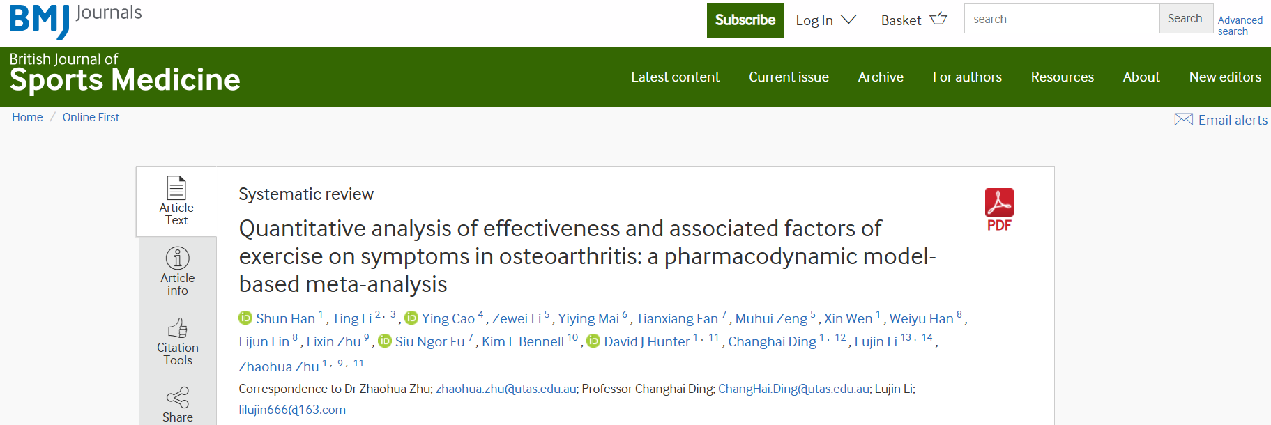 近日,sunbet申搏官网交叉科学研究院郑青山和李禄金团队与南方医科大学珠江医院临床研究中心合作开展的锻炼治疗骨关节炎临床疗效建模研究成果Quantitative analysis of effectiveness and associated factors of exercise on symptoms in osteoarthritis在British Journal of Sports Medicine发表,该刊为英国医学杂志(BMJ)子刊,在运动医学领域排名第一。