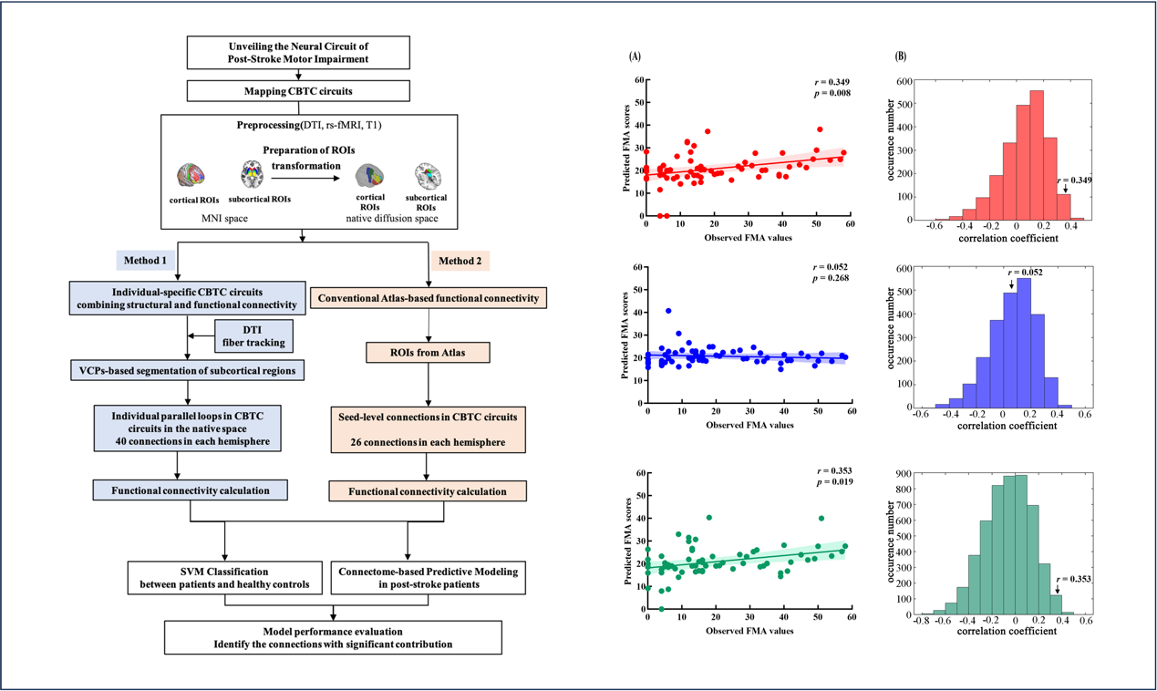 该研究分别纳入了64例脑卒中患者和64例健康受试者,利用大脑弥散张量成像(diffusion tensor imaging,DTI),以尾状核、壳核、苍白球和丘脑为种子点,M1、前运动皮质(premotor cortex,PreM)、背外侧前额叶(dorsolateral prefrontal cortex,DLPFC)、内侧前额叶(medial prefrontal cortex,MPFC)和眶额叶(orbitofrontal cortex,OFC)为目标脑区进行概率性纤维追踪,实现在个体空间对皮质下核团的分割,基于结构连接个体水平精准构建CBTC环路,包括“长环路”(皮质-纹状体-苍白球-丘脑-皮质环路)和“短环路”(皮质-纹状体-丘脑-皮质环路)。再将弥散像分割后的各环路脑区配准至功能像,计算CBTC神经环路的各功能连接。在此基础上,一方面从功能连接(functional connectivity,FC)角度对比了常规的基于脑区图谱(atlas)的构建方法和个体水平基于结构连接的构建方法,另一方面通过机器学习标定CBTC神经环路中促进脑卒中上肢运动功能康复的关键连接。基于连接组的预测模型(connectome-based predictive modeling,CPM)研究结果显示,在个体化映射的CBTC神经环路中,正连接(positive connection)可预测Fugl-Meyer上肢运动功能评分,其中预测性能最好的正连接为患侧CBTC短环路中的“M1-尾状核”连接。