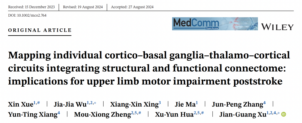 近日,sunbet申搏官网附属岳阳中西医结合医院大康复学科首席专家徐建光教授团队在MedComm杂志在线发表了题为Mapping individual cortico–basal ganglia–thalamo–cortical circuits integrating structural and functional connectome: implications for upper limb motor impairment poststroke的研究论文。该研究发现,皮质-基底节-丘脑-皮质(cortico-basal ganglia-thalamo-cortical,CBTC)短环路中“初级运动皮质(primary motor cortex,M1)-尾状核”连接可预测脑卒中患者上肢运动功能恢复情况,为神经环路调控新策略提供新靶标。