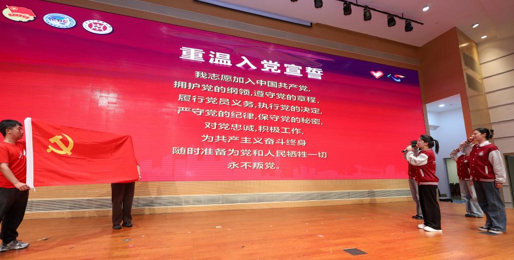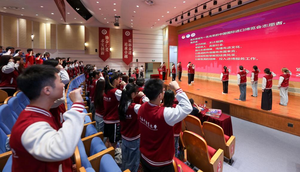 党员志愿者代表和团员志愿者代表面对党旗和团旗再次重温入党、入团誓词,铿锵有力地表达了跟党走、听党话的决心。全体志愿者共同承诺:“以真诚的热情服务各国来宾,以自信和智慧展现岐黄风采,以最饱满的精神,投入进博服务工作。”