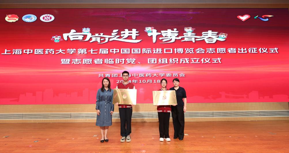 与会领导为志愿者代表颁发上中医进博大礼包,将学校的温暖与关爱传递给志愿者们,并为第七届进博会志愿者临时党、团组织授牌,希望临时党、团组织充分发挥战斗堡垒作用,带领全体志愿者共同做好进博会志愿服务工作。