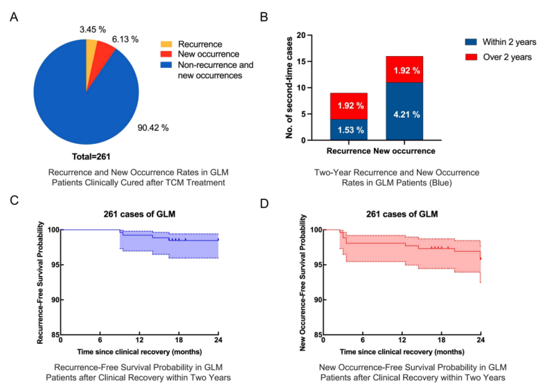 GLM是一种慢性炎性乳腺疾病,临床表现多样,易复发且治疗具有挑战性。传统的治疗方法包括抗生素、激素和手术,但疗效有限且副作用较大。中药治疗因其疗效显著,日益受到广泛关注。然而,仍有部分患者在临床治愈后,尤其是在两年内会出现复发(在以前的病灶)或新发(在新的病灶)的情况。
