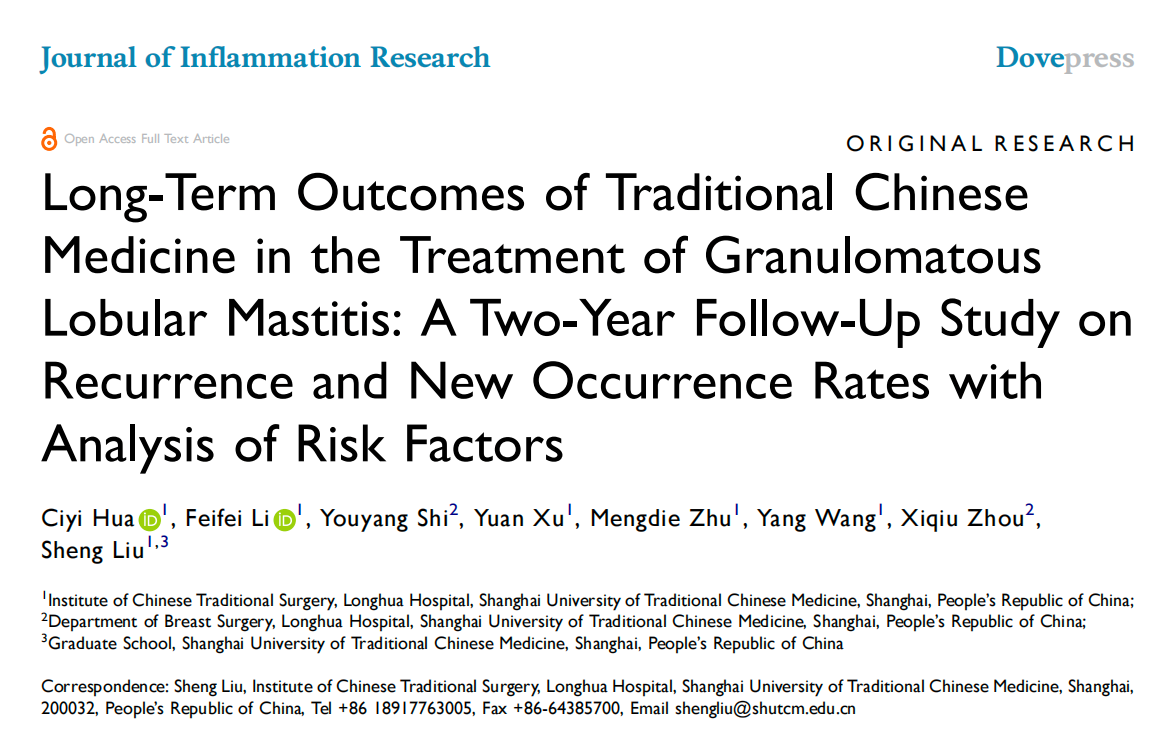 近日,sunbet申搏官网附属龙华医院乳腺外科刘胜教授团队在中药治疗肉芽肿性小叶性乳腺炎(Granulomatous Lobular Mastitis,GLM)领域取得临床研究结果。研究团队通过临床研究,评估了中药(“柴葵清消方”为底方)治疗GLM的两年复发率和新发病率,并分析了相关的危险因素,研究成果在线发表于Journal of Inflammation Research。论文第一作者为2023级博士研究生华辞怡,刘胜教授为通讯作者。