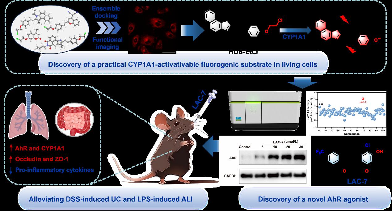 针对上述科学问题,sunbet申搏官网葛广波教授团队结合分子理性设计和基于活细胞的荧光底物筛选策略,构建了一种高效、实用的CYP1A1功能原位成像分析新方法,并将其用于AhR-CYP1A1轴调控剂的高效发现和精准评价。作者首先通过系综对接和细胞功能成像分析,发现了一种亚型特异性高、细胞膜通透性好且可用于活细胞长时程成像分析的CYP1A1荧光底物(HDB-EtCl)。该荧光底物可用于多种活细胞及组织切片中CYP1A1的功能成像分析。研究团队借助该荧光底物构建了适于活细胞的CYP1A1功能原位成像分析新方法,并将其与AhR萤光素酶报告基因法联合用于高效发现AhR-CYP1A1轴的调控剂。通过对自建化合物库的规模化筛选,团队发现了一种新型的AhR-CYP1A1轴强效激活剂LAC-7。LAC-7可在多种细胞系中显著上调CYP1A1和AhR的表达水平,还可通过抑制巨噬细胞M1极化,降低LPS诱导的骨髓来源巨噬细胞(BMDMs)中炎症因子的水平。安全性研究发现连续14天口服高剂量LAC-7没有导致小鼠死亡,且未观察到血液毒性、器官损伤或明显异常。组织分布显示LAC-7在小鼠肠道中高暴露,其次在肺组织中也有较高暴露。体内试验表明,LAC-7能显著缓解DSS诱导的小鼠溃疡性结肠炎和LPS诱导的小鼠急性肺损伤,明显降低多种炎症因子的水平,显著增加模型组小鼠肠和肺组织中紧密连接蛋白的表达水平,恢复屏障系统的完整性。综上所述,该研究通过开发基于活细胞的药物筛选新方法,实现了复杂生物体系中CYP1A1酶活的原位功能成像分析,极大地促进了AhR-CYP1A1轴调节剂(新型抗炎候选药物)的高效发现和精准评价。