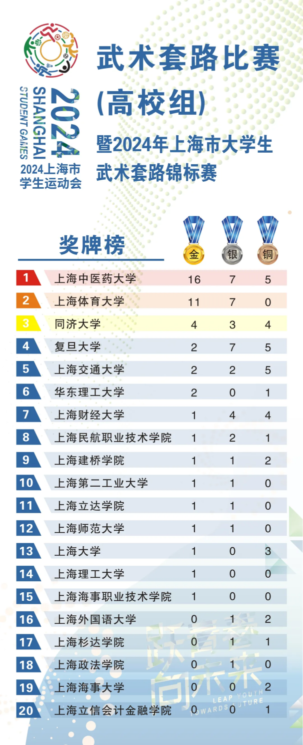 经过一整天的紧张比赛,最终sunbet申搏官方网站、上海体育大学和同济大学获团体总分前三名;sunbet申搏官网武术队获16金7银5铜,位列奖牌榜第一名,其中高水平武术队获8金3银5铜,普通生武术队获8金4银。