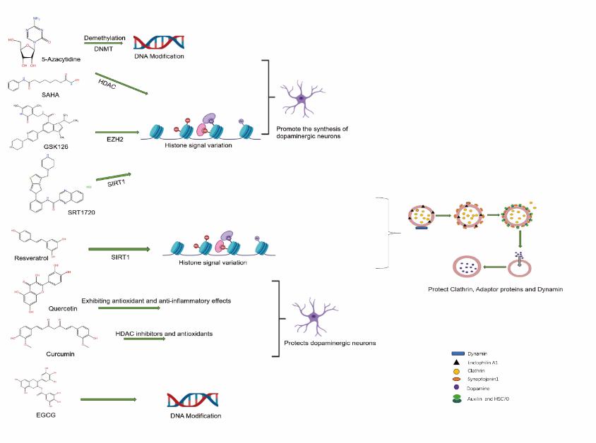 图:部分小分子抑制剂通过表观遗传机制调控DAT内吞过程中关键受体或靶点。