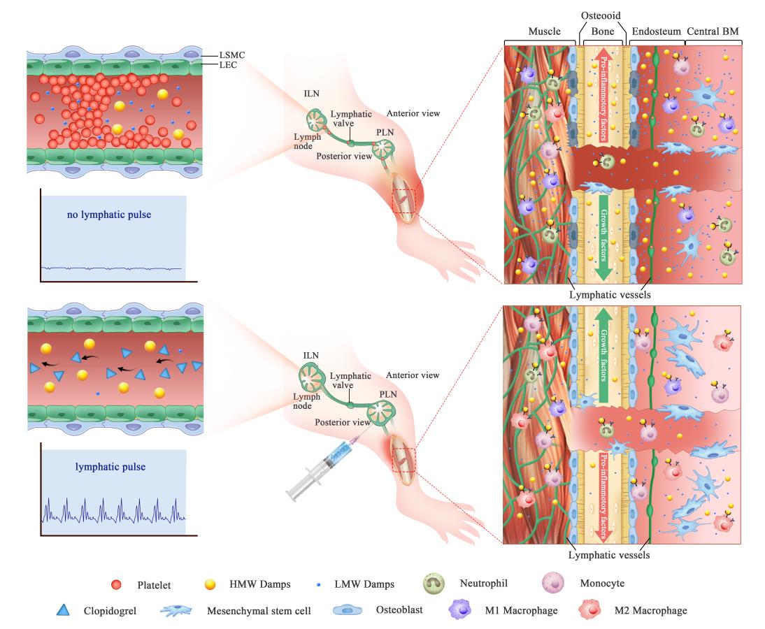 该研究在中医“瘀血理论”指导下,结合国医大师施杞教授治疗骨折的临床经验,率先发现骨折诱发大量淋巴管血小板栓形成,即“脉内瘀血”的重要物质基础,造成淋巴管回流障碍,延缓骨折修复;清除淋巴管血小板栓,疏通“脉内瘀阻”,可促进淋巴引流,加速骨折愈合。进一步研究发现疏通的淋巴管通过转运DAMPs改善组织微环境,促进骨折愈合。该研究不仅提示淋巴管系统是促进骨修复的潜在靶点,也为临床组织修复、围手术期管理、出凝血疾病、免疫炎症性疾病等领域研究提供新思路,并进一步丰富和发展了“瘀血理论”。