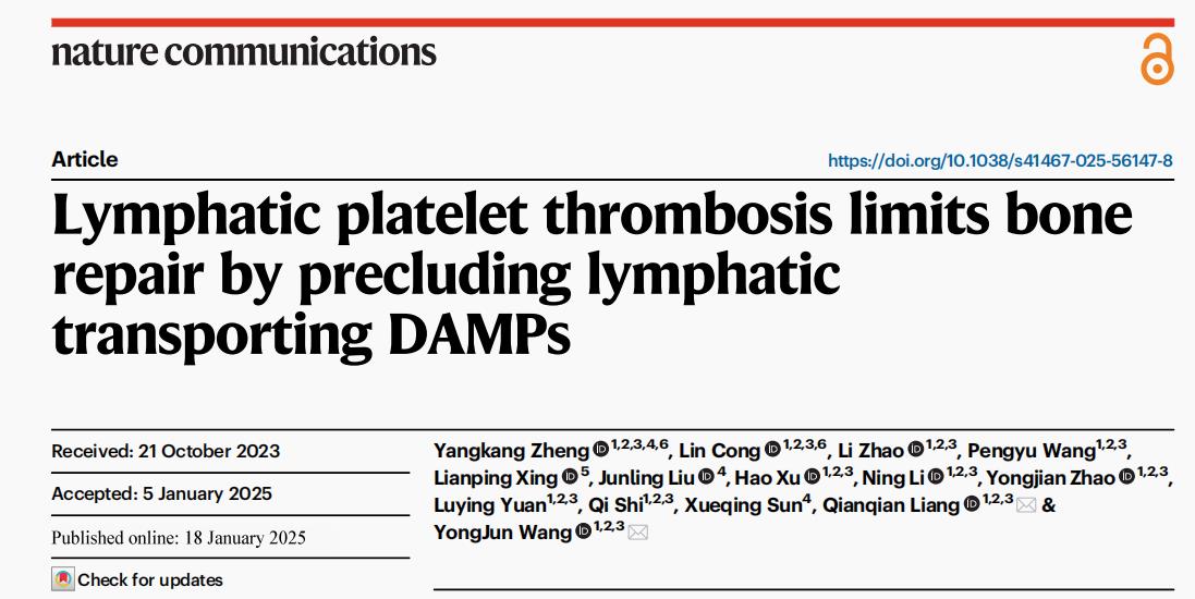 1月18日,sunbet申搏官网王拥军教授、梁倩倩研究员(通讯作者)带领郑扬康博士和丛林博士后(第一作者)等团队成员,在Nature Communications杂志发表了题为Lymphatic platelet thrombosis limits bone repair by precluding lymphatic transporting DAMPs的研究论文。该研究首先发现骨折小鼠存在持续两周左右的淋巴管回流功能障碍,促进淋巴管回流功能加速骨折愈合;进一步证实淋巴管血小板栓(lymphatic platelet thrombosis, LPT)是造成骨折后淋巴管回流功能障碍的主要原因,抗淋巴管血小板栓疗法能恢复淋巴管回流功能加速骨折愈合;通过大鼠胸导管引流术、淋巴液蛋白组学、淋巴结多重免疫组化等技术揭示淋巴管回流促进骨折愈合的机制是疏通的淋巴管通过转运DAMPs、免疫调控血肿微环境、减少成骨细胞凋亡和促进骨髓来源间充质干细胞增殖。