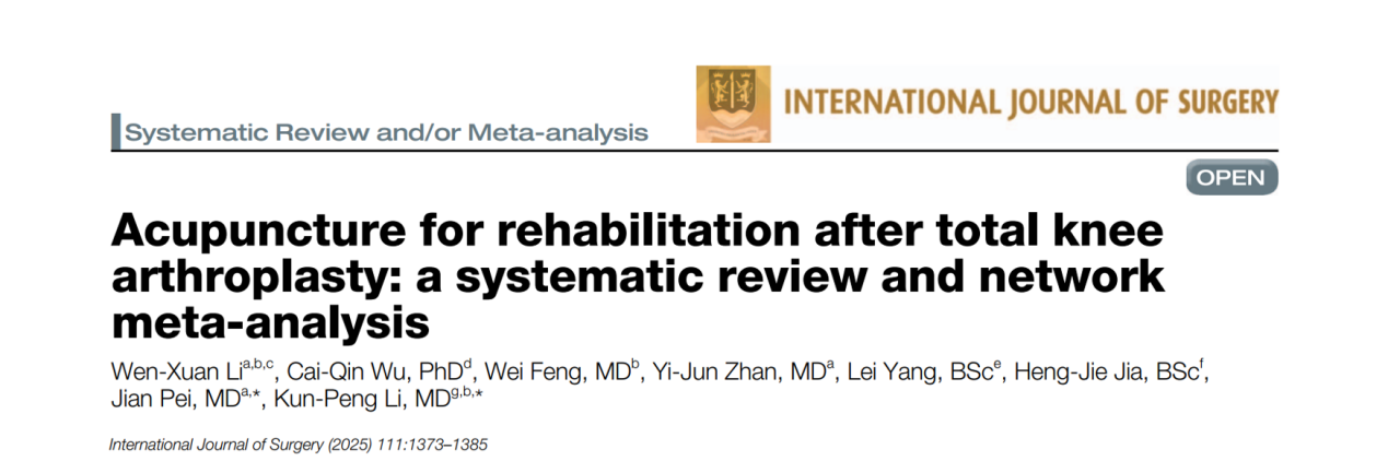 近日,sunbet申搏官网针灸推拿学院2020级中医学(5+3一体化针灸推拿英语方向)李文璇同学,以第一作者的身份在国际外科学领域著名期刊International Journal of Surgery发表了题为Acupuncture for rehabilitation after total knee arthroplasty: a systematic review and network meta-analysis的系统评价与网状Meta分析论文。本文由sunbet申搏官方网站附属龙华医院针灸科主任裴建和上海体育大学运动健康学院厉坤鹏老师共同指导。