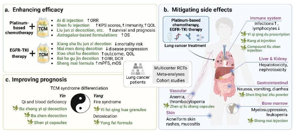 在这一背景下,中医药在肺癌治疗中的作用受到了越来越多的关注。与传统的放化疗等以直接杀灭肿瘤细胞为目标的治疗手段不同,中医药强调整体观念,倡导“带瘤生存”的理念。其不仅关注疾病本身的进展,更注重调理患者的整体状态,旨在提高生活质量、延长生存期。大量临床研究表明,中医药在肺癌治疗中表现出独特的优势。与常规治疗联合应用时,可显著增强治疗效果,减轻放化疗的毒副作用,并改善患者的免疫功能。此外,中医药在逆转肿瘤耐药性、抑制转移和复发等方面也展现出潜在的应用前景。