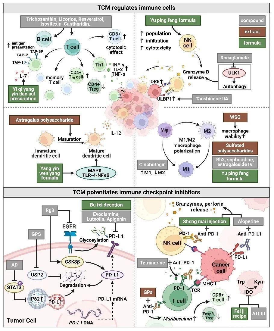 在抗肿瘤转移方面,中药具有多环节的调控作用:一方面可通过抑制血管内皮生长因子(VEGF)信号通路来阻断肿瘤血管生成;另一方面能够调节转移前微环境的形成,抑制上皮-间质转化(EMT)过程,从而降低肺癌细胞的侵袭和转移能力。值得注意的是,中药在免疫调节方面展现出独特优势,其可通过激活自然杀伤细胞(NK细胞)、调节T淋巴细胞亚群平衡、促进树突状细胞成熟等多种途径增强机体抗肿瘤免疫应答。特别是在免疫检查点抑制剂治疗中,中药可协同增强程序性死亡受体-1(PD-1)/程序性死亡配体-1(PD-L1)抑制剂的疗效,为肺癌的免疫治疗提供了新的思路。