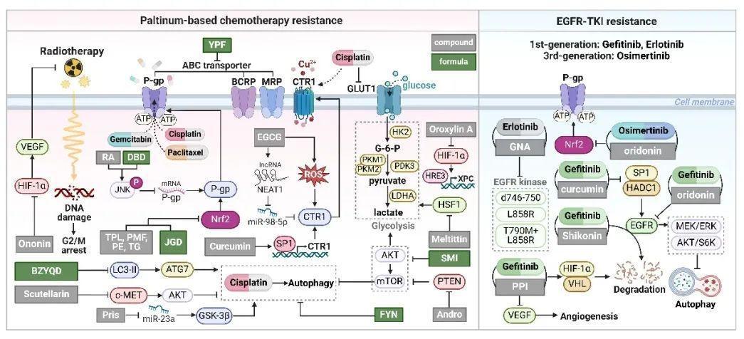 近年来,大量临床前研究深入揭示了中药治疗肺癌的多靶点分子机制,为中医药在肺癌治疗中的应用提供了坚实的科学依据。研究表明,中药可通过多途径诱导肺癌细胞发生程序性死亡,包括但不限于细胞凋亡、自噬、焦亡及铁死亡等多种细胞死亡机制。在联合治疗方面,中药展现出显著的协同增效作用,其通过调控ABC转运体家族蛋白表达、抑制糖酵解关键酶活性、调节表皮生长因子受体(EGFR)信号通路等多种分子机制,有效逆转肿瘤细胞对化疗药物和靶向药物的耐药性。