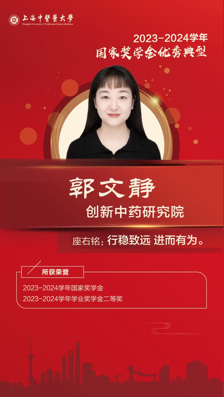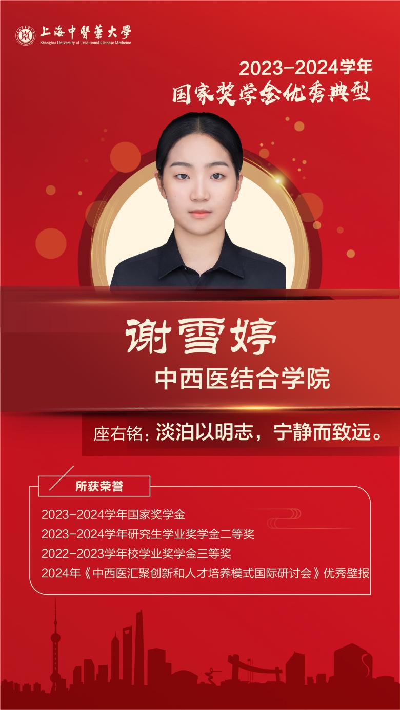入校以来参与多个科研项目,具有较好的实验技能和文献研究能力;积极参加创新创业大赛并多次获得奖项。在学生工作与志愿服务中,她以实际行动诠释中医药学子的责任感与使命感,在多个岗位担任学生干部,获评优秀学生标兵和优秀学生干部等;累计志愿服务时长达400小时。未来,她将砥砺奋进,以更加坚定的信念迎接新时代的挑战,为中医药事业的发展贡献青春力量。