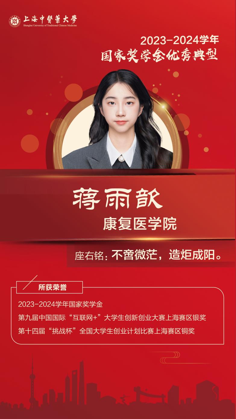 以专业为树石、以实践为涉笔。不断深化学习,绩点保持专业第一。用心倾听患者的需求和故事,开发“康烁调神”设备和“双循环”系统,获得2项市级奖项。努力成为患者康复路上的同行者。作为学生干部,组织岐黄志愿队开展适老化义诊服务,获得2023-2024学年五四红旗团委。在未来,她将继续以“心”为指引,以“行”为实践,带动更多人投身于康复领域。