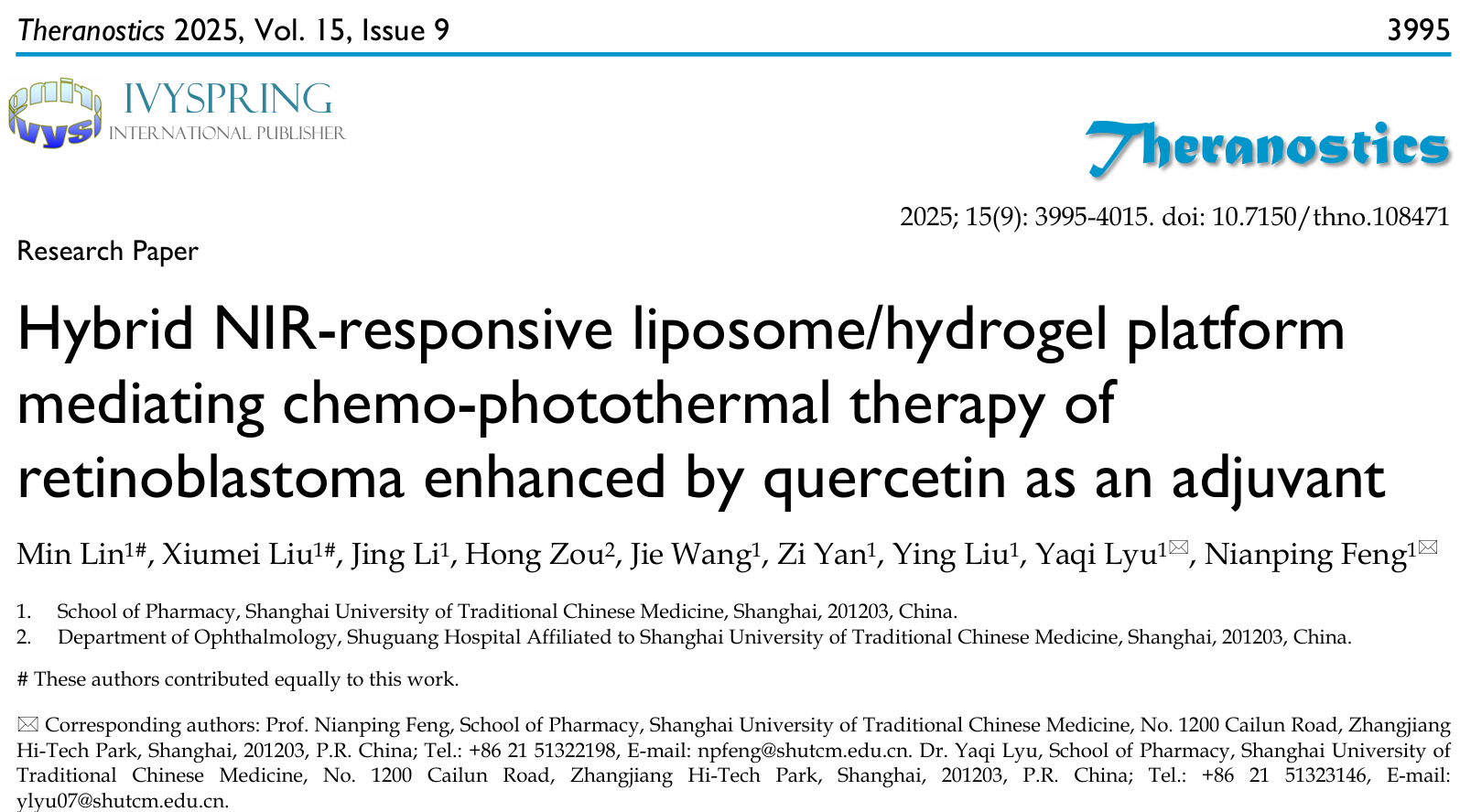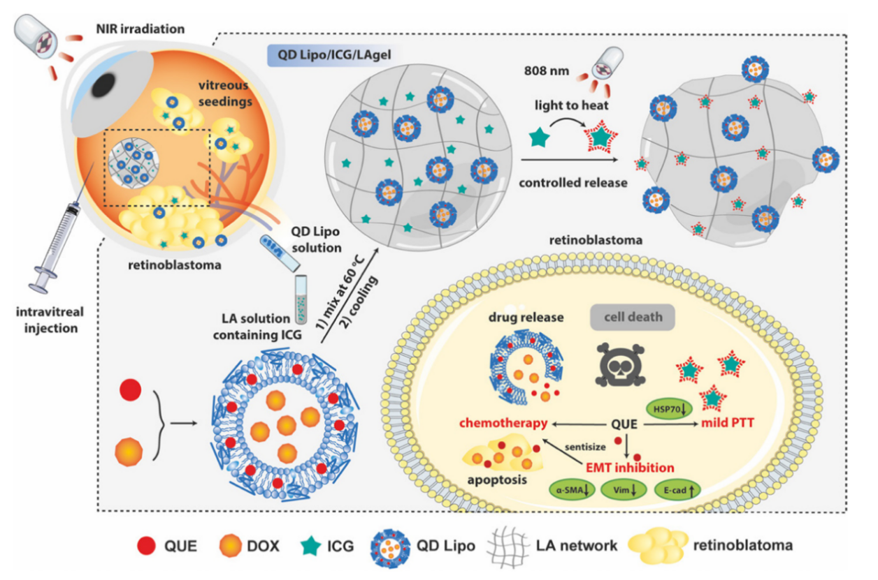 近日,sunbet申搏官网中药学院冯年平、吕雅琪团队在Theranostics发表题为Hybrid NIR-responsive liposome/hydrogel platform mediating chemo-photothermal therapy of retinoblastoma enhanced by quercetin as an adjuvant的研究成果。该研究报道了一种基于共载槲皮素/多柔比星脂质体(QD Lipo)的吲哚菁绿-低熔点琼脂糖水凝胶(QD Lipo/ICG/LAgel)。QD Lipo/ICG/LAgel是一种具有光热响应能力的可注射水凝胶药物递送系统,通过玻璃体注射将QD Lipo/ICG/LAgel植入玻璃体腔,利用近红外光的照射远程控制负载脂质体与光敏剂的释放,通过玻璃体腔内的局部可控化疗-光热治疗联合提升视网膜母细胞瘤的疗效,为视网膜母细胞瘤的治疗提供新的模式。