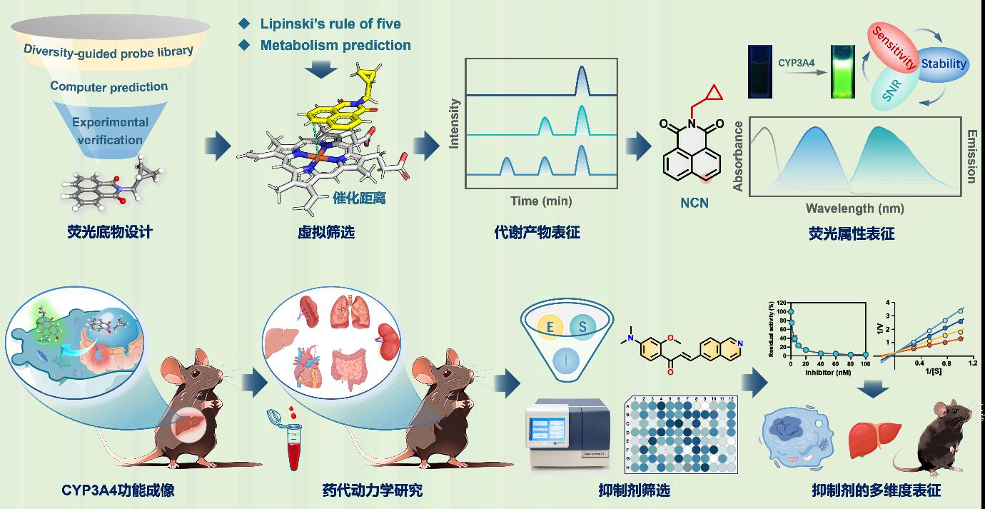CYP3A4是人体最重要的药物代谢酶之一,其参与众多药物的代谢清除和代谢活化。长期以来,复杂生物体系中CYP3A4活性的检测主要依赖其药物底物和生理底物(如睾酮、咪达唑仑等)。CYP3A4药物/生理底物及其氧化产物的定量需借助液相色谱-质谱联用技术,该方法需要昂贵的设备和专业的操作人员,且样品前处理和分析过程相对耗时。相比之下,酶激活的荧光底物具有操作简单、响应快速、灵敏度高、适于高通量检测和原位超分辨率成像分析等优势,是开展目标酶亚细胞分布和功能检测的有力工具。但已报道的CYP3A4荧光底物多为P-糖蛋白(P-gp)的底物且无法口服吸收,严重制约了其在活体和活组织等复杂生物体系中的应用。因此,业界亟需研发口服有效且不受P-gp干扰的CYP3A4特异性荧光底物,进而用于复杂生命系统中CYP3A4的功能成像分析。