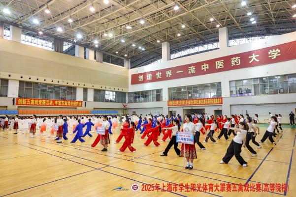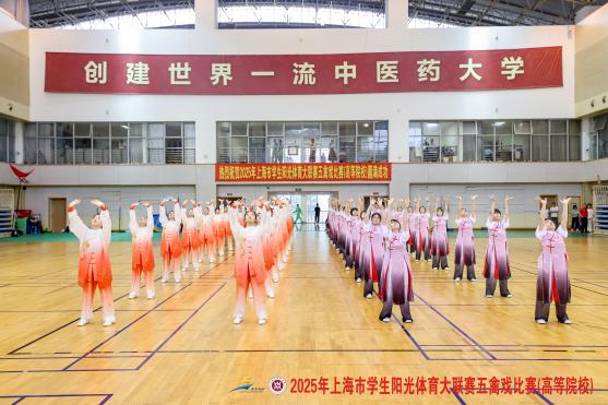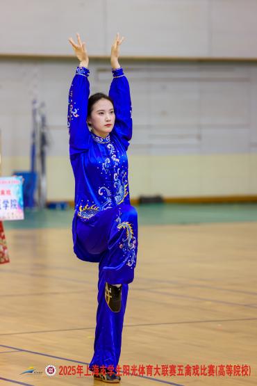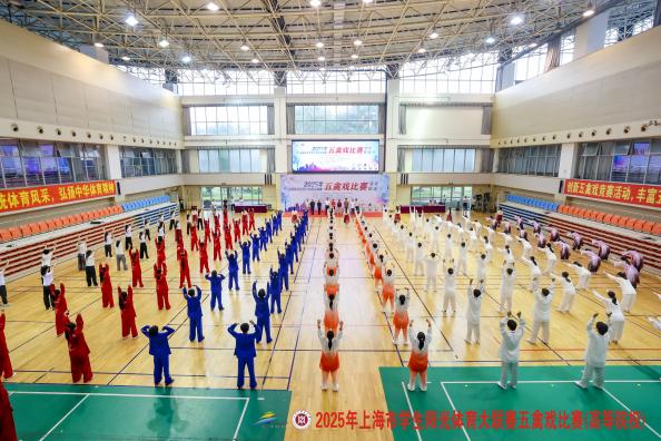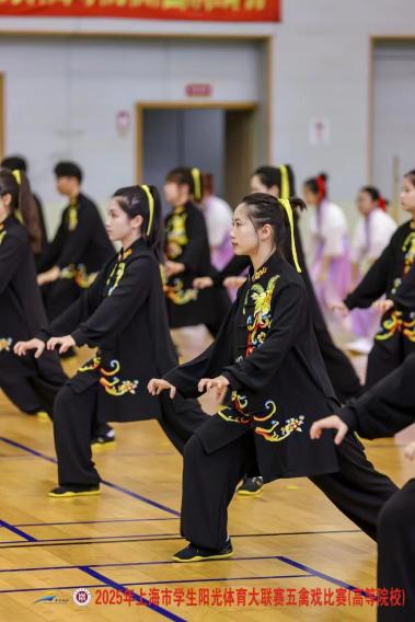 2023年,五禽戏首次作为上海市学生阳光体育大联赛比赛项目,吸引了10所高校300多名运动员参赛。两年间,这项赛事规模持续扩大。在比赛现场,参赛队员们身着统一服装,伴随着悠扬音乐,将五种动物的神韵演绎得惟妙惟肖。虎戏似猛虎出山,气势磅礴;鹿戏若灵鹿跃涧,轻盈敏捷;熊戏如笨熊漫步,沉稳厚重;猿戏像猿猴嬉闹,灵活俏皮;鸟戏仿佛飞鸟凌空,优雅舒展。