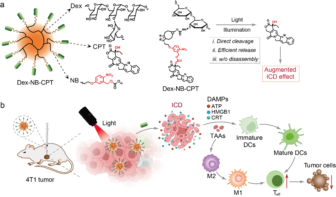 近日,sunbet申搏官网交叉科学研究院邓洪平、许莉、葛广波团队在国际刊物Carbohydrate Polymers在线发表题为“A light-controlled dextran nano-immunomodulator amplifies immunogenic cell death for cancer immunotherapy”的研究论文。该研究成功设计开发了一种基于葡聚糖的光控喜树碱(Camptothecin,CPT)纳米免疫调节剂,通过精准控制药物释放过程,显著增强了肿瘤免疫原性细胞死亡(ICD)效应,为肿瘤免疫治疗提供新策略。