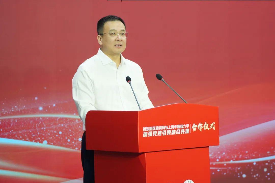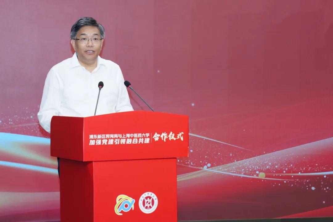 曹锡康在讲话中指出,此次合作标志着双方实现了合作层次的进一步深化与升华,旨在进一步发挥浦东新区教育综合改革政策优势与上中医的科研、师资及平台禀赋,让深度融合的“区校联动”成为区域教育高质量发展的“红色引擎”。他提出三点殷切期望:一是坚持党建引领,贯通大中小幼一体化育人体系;二是聚焦能力提升,共育新时代高素质教师队伍;三是创新合作机制,打造区域党建与教育融合新标杆。期待双方以本次合作为新起点,以更加主动的姿态、更加务实的举措,共同探索大中小幼党建共建、合作创新的新模式,打造区域党建特色品牌,树立浦东教育高质量发展的旗帜。