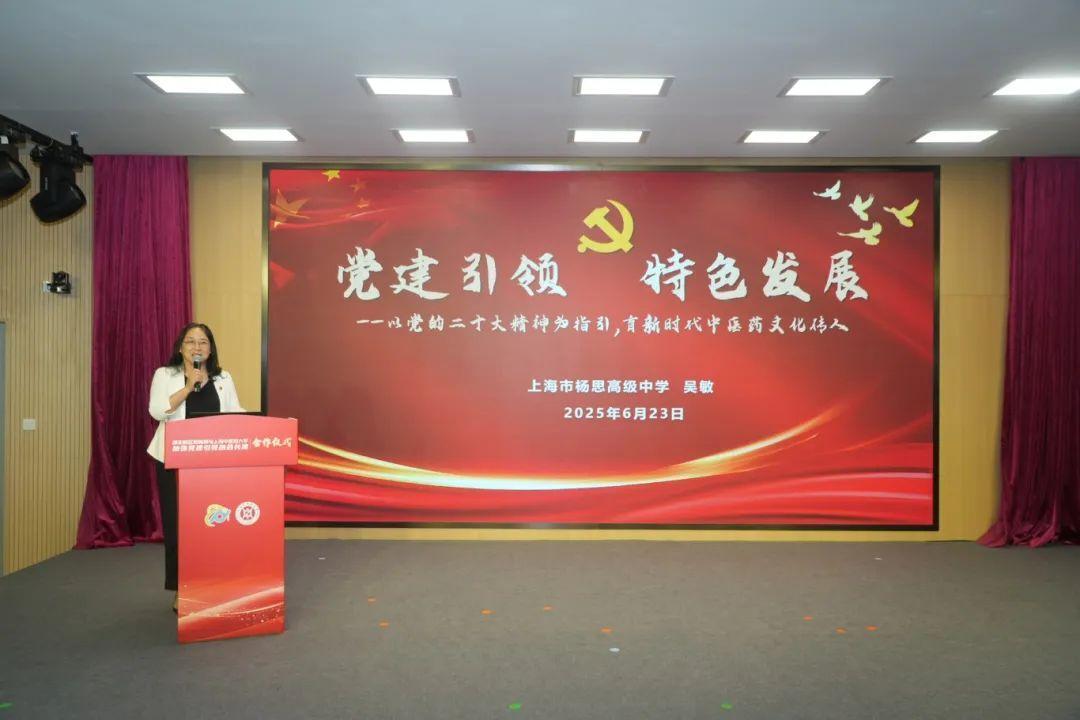 合作仪式上,上海市杨思高级中学党总支书记、校长吴敏带来题为《党建引领 特色发展——以党的二十大精神为指引,育新时代中医药文化传人》的微党课。她从党的二十大精神出发,深入阐述党建引领在学校特色发展中的重要作用,介绍学校在数字赋能、双新支撑背景下以中医药文化素养育人的新思路、新路径。