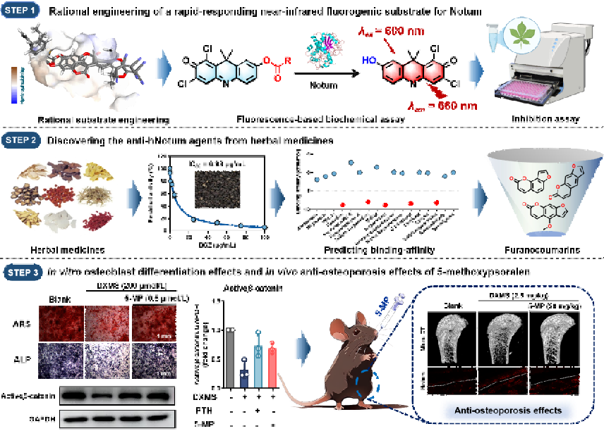 为此,该团队首先设计研发了一种新型近红外荧光底物DO,结合计算机虚拟筛选和分子实验验证,用于高效筛选和表征具有强效抗Notum作用的中草药。借助该技术,研究人员发现临床常用补骨中药补骨脂表现出对Notum的强效竞争性抑制,进一步借助质谱成分鉴定、虚拟筛选和酶学实验验证,从补骨脂中高效发现三种呋喃香豆素类化合物:5-甲氧基补骨脂素(5-MP)、补骨脂素、异补骨脂素,是天然存在的强效Notum抑制剂。其中5-MP表现出最强的Notum抑制活性(IC50=18.73nmol/L)。进一步研究发现,Notum催化口袋中的两个关键氨基酸Phe268和Trp128在其水解功能中发挥了决定性作用,而5-MP通过与Phe268和Trp128形成强相互作用发挥Notum竞争性抑制作用。安全性实验评估发现,补骨脂素和异补骨脂素显现出多脏器毒性,而5-MP则展现出良好的安全性。细胞和动物整体实验发现,5-MP既能抑制Notum活性还可下调Notum表达,进而激活Wnt/β-catenin信号通路并显著改善地塞米松诱导的小鼠骨质疏松症状。