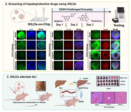 基于3HLOs及其芯片平台,研究团队成功构建了高仿生的酒精性肝损伤模型。该模型准确模拟了酒精引发的氧化应激、线粒体功能障碍、肝细胞坏死及ALT/AST升高等典型肝脏病理特征。借助该模型,发现芹菜素、木兰花碱等天然产物具有良好的保肝活性,其药效与阳性对照药物非诺贝特相当。进一步借助酒精性肝损伤小鼠模型,验证了上述天然产物在动物整体水平的保肝作用,相关结果证实了3HLOs在保肝药物筛选与评价中的可靠性。更为重要的是,团队将3HLOs移植至终末期酒精性肝损伤小鼠体内后,其死亡率显著下降(从约90%降至25%),同时肝脏脂肪变性、肝损伤相关血清学指标等也大幅改善。机制研究表明:移植后的3HLOs通过建立的血管连接向宿主循环系统分泌人源急性期蛋白(如A1AT、AACT),这些蛋白发挥了抗炎与脂质调节作用,从而有效缓解了酒精引发的肝脏损伤。