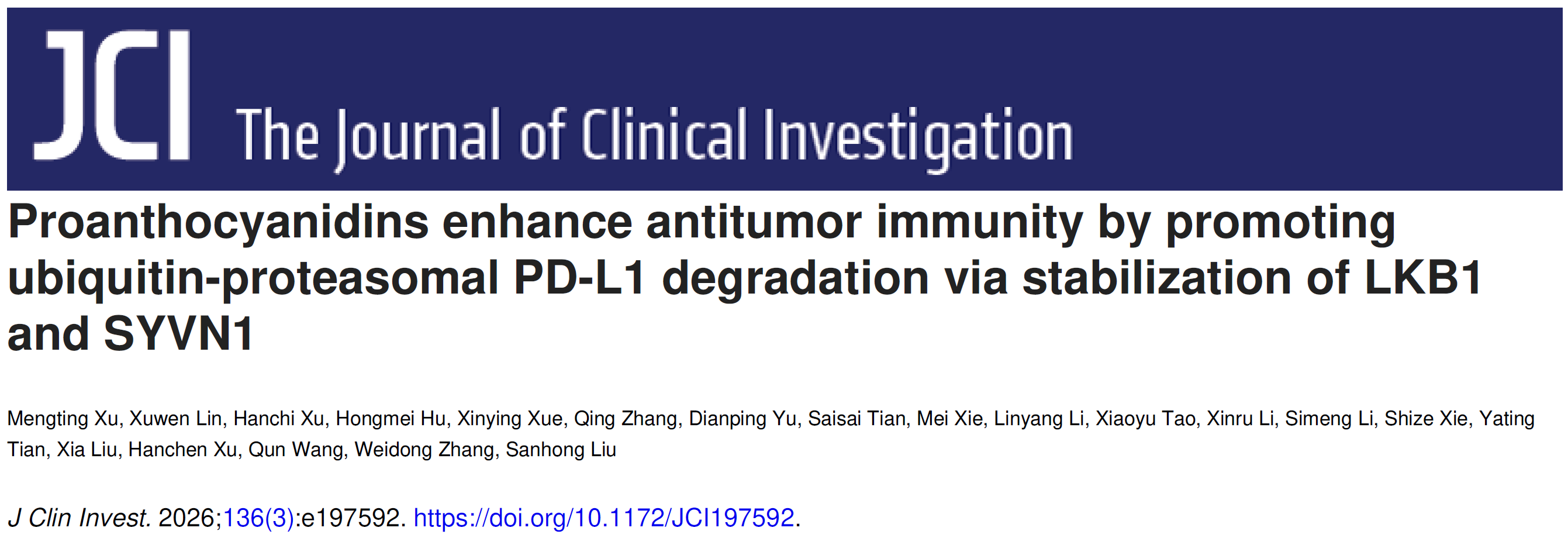 近日,sunbet申搏官网交叉科学研究院刘三宏团队联合海军军医大学张卫东、刘霞团队及龙华医院徐汉辰团队,在国际权威学术期刊《Journal of Clinical Investigation》发表重要研究成果。论文以“Proanthocyanidins enhance antitumor immunity by promoting ubiquitin-proteasomal PD-L1 degradation via stabilization of LKB1 and SYVN1”为题,首次系统阐明了葡萄籽等植物中富含的低聚黄酮类化合物原花青素作为新型免疫检查点调节剂的分子机制与治疗潜力,为肿瘤免疫治疗开辟了全新路径。