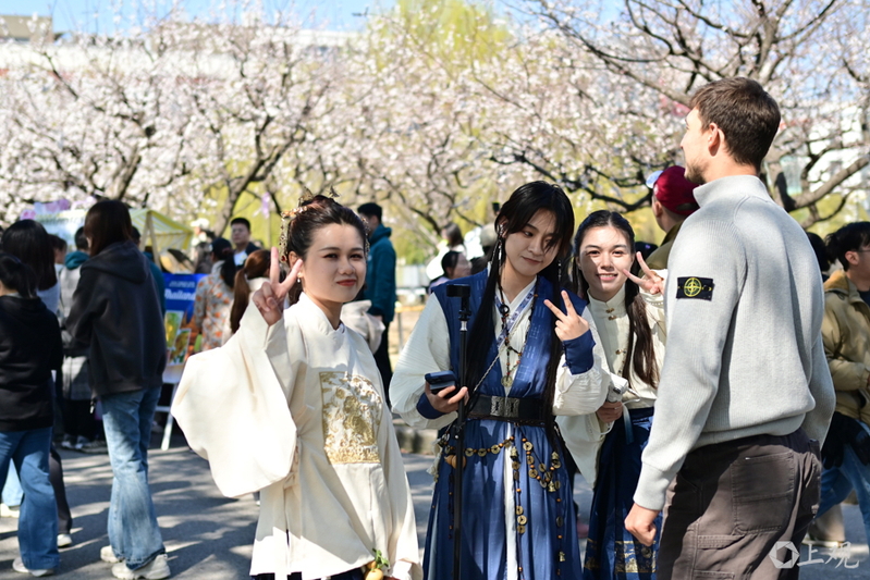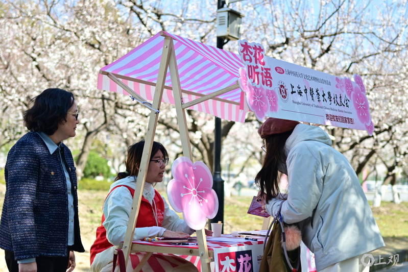 解放日报·上观新闻记者了解到,上中医全日制在校学生9000多人,校友遍布70多个国家和地区。其中,在读留学生达上千人,所占在校生比例在上海各大高校中数一数二。“杏林游园”正是各个大学生社团搭建的传统与现代交融的育人场域,从杏花茶引、杏仁点心等药食同源技艺演示,到杏花书签、杏花香扇等杏元素制品手作,中外师生们共赴这一场春日雅集。