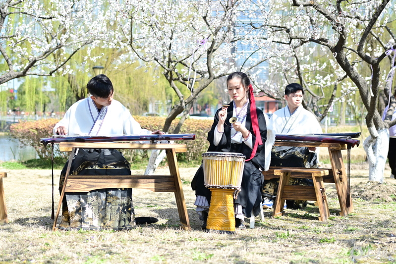 50多岁的余荆意女士,与“00后”留学生一样身着汉服,在大片杏花林中悠然抚琴。原来,她并非古琴社团的指导老师,而是从美国加州大学旧金山分校跨洋求学的大三本科生,“在中医大既能学到道地中医,又能与年轻人演奏传统乐器,真是好事成双。”