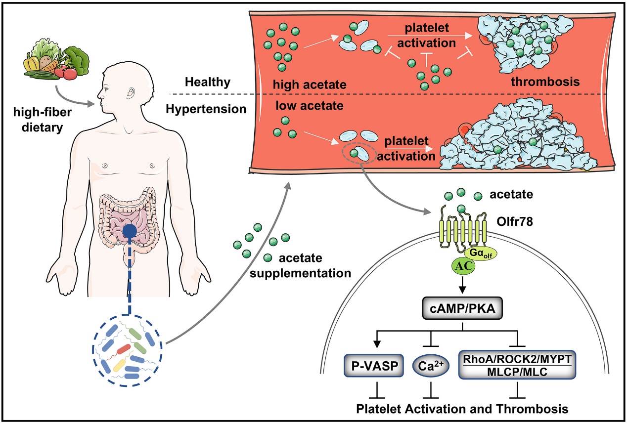 团队基于中医 “心与小肠相表里” 理论,通过多组学研究系统揭示了肠道菌群代谢产物乙酸盐在高血压血栓事件中的关键调控作用,证实乙酸盐缺失是高血压血瘀证形成的关键代谢环节。研究还首次发现,血小板嗅觉受体Olfr78 是乙酸盐发挥“活血通脉”效应的特异性作用靶点,乙酸盐可通过结合该受体,调控下游cAMP/PKA/(VASP+Ca²⁺+RhoA) 信号通路,进而抑制血小板异常活化。