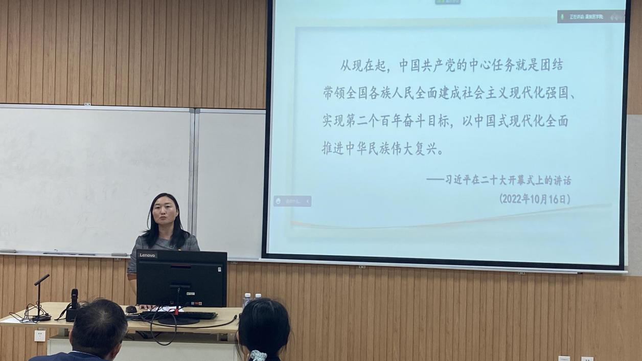 为深入学习宣传贯彻党的二十大精神,引领全院师生在学深悟透中汲取奋进力量,康复医学院举办“深入学习宣传贯彻党的二十大精神”专题系列党课讲座,首场讲座于11月9日开讲。院领导班子、全体教师、学生党员于主会场10105教室参加学习,惠南校区学生于该校区分会场参加学习,其余学生全部线上参与学习。本次讲座由康复医学院党总支副书记毕亚男主持。
