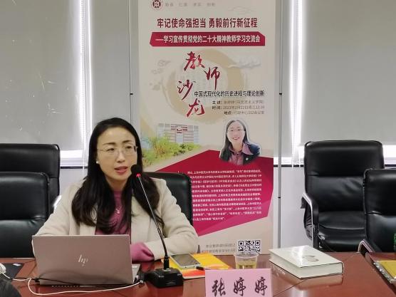 为持续深入学习宣传贯彻党的二十大精神,引导广大青年教师从党的二十大精神中汲取奋进的力量,2月22日下午,“牢记使命强担当 勇毅前行新征程——深入学习宣传贯彻党的二十大精神”专题系列第三期教师学习交流会暨第35期“杏林有约”教师午间沙龙在行政中心312会议室举办。sunbet申搏官网“杏马”理论宣讲团成员、马克思主义学院副院长张婷婷副教授受邀作专题辅导报告,主题为“中国式现代化的历史进程与理论创新”。宣传部(党委教师工作部)副部长刘虹主持会议,并向张婷婷颁发“阳光导师”荣誉证书。教师党支部书记、青年教师班主任等40余位教师参加学习交流。