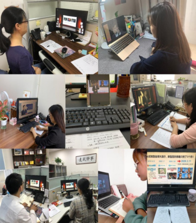 师生、医务工作者们在实验室、办公室、会议室、训练室、寝室和家里利用手机、电脑来观看视频直播。