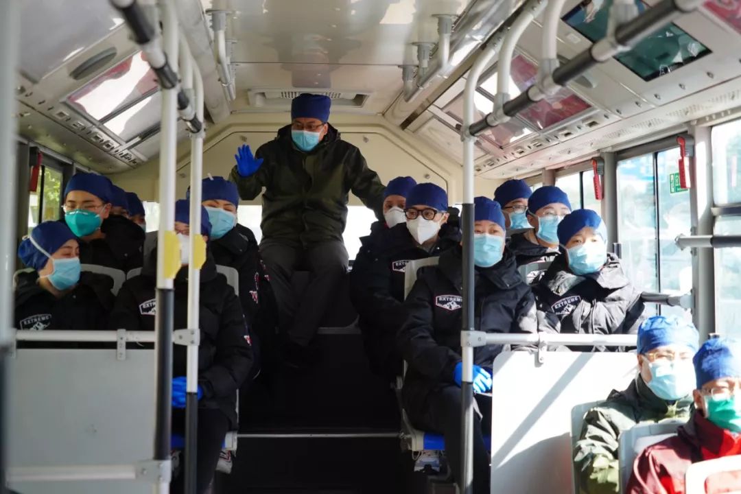 13时23分,医疗队所有122名队员乘公交车去熟悉“主战场”——雷神山医院。当地司机很热心,主动帮助搬运呼吸机。岳阳中西医结合医院副院长、上海医疗队副领队李斌告诉同车队员,此去要代表中医形象,也要代表医疗队形象。或许是为了活跃气氛,经历过“小汤山”、汶川地震救援的“老兵”樊民给大家讲起了之前的故事。“‘小汤山’当年很多年轻医生和刚毕业的护士,大家是从穿着防护服、戴着口罩护目镜认识彼此的,等到脱了防护服,相认居然要愣神儿。” 行驶了50分钟,车队抵达了雷神山医院的大门,全副武装的检查人员提示着形势的严峻。司机特意让队员们下车留念,不少人对着镜头比出加油的手势。兵分两路,医生学习HIS系统,护士熟悉病房。