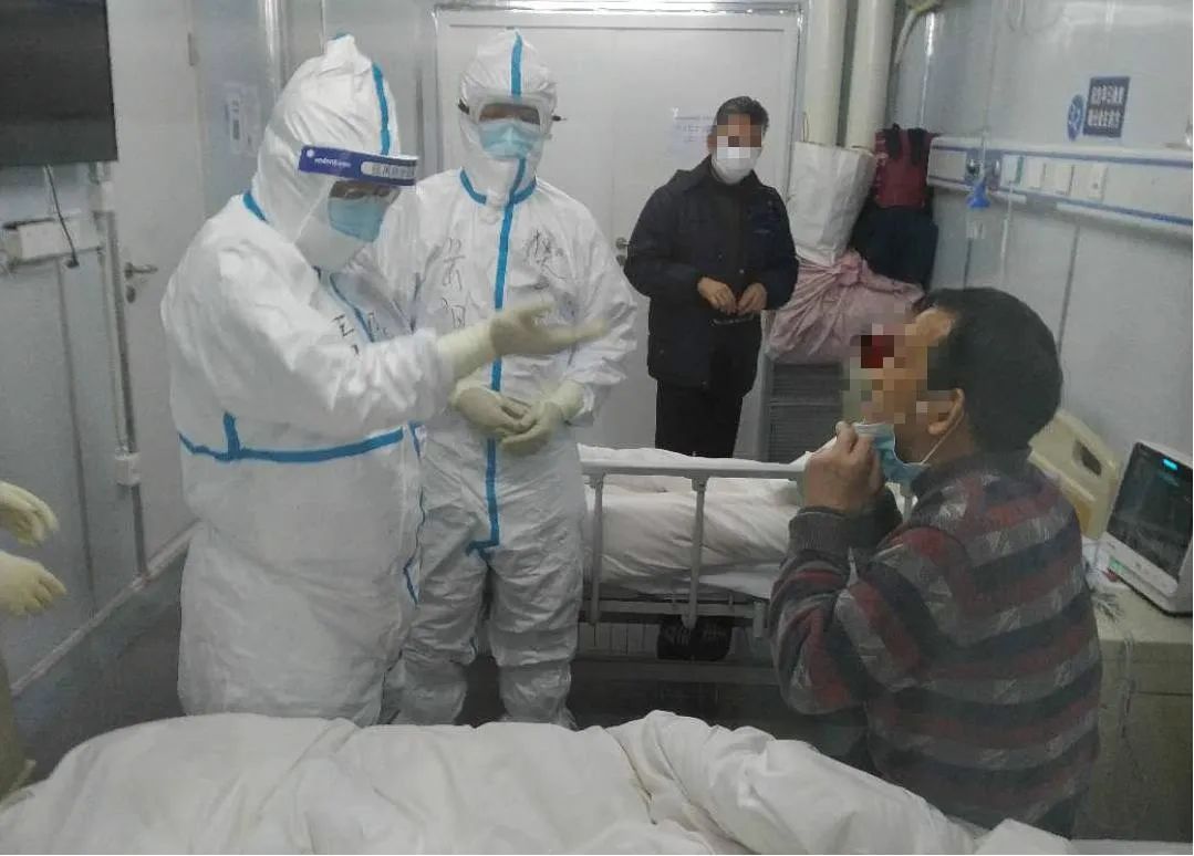 因为任务重,冯其茂、李海涛、折哲三位医生都穿上防护服一起进病房。由于内外温差的缘故,护目镜和眼镜上都蒙上了雾气,视线受到很大影响,冯其茂和李海涛两位医生只能搭着不戴眼镜的折哲医生的肩,让折哲来领路。三人分别负责问病史、看CT片做记录、开关房门记录影像资料,同时鼓励患者要有信心。查房时,医生和患者都戴着很厚的口罩,很多患者交流时只用武汉当地方言,队员们大声反复询问,最后嗓子干得就像在冒着火。出病房污染区时洗手脱衣也是个很费时间的事,消毒一点也不能马虎,不然就会给战友们的健康安全带来极大风险,李海涛说道,“医疗工作离不开团队的相互配合,感谢战友们!”