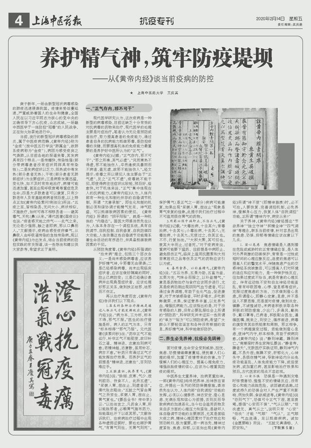 sunbet申搏官方网站终身教授王庆其发表科普文章:养护精气神,筑牢防疫堤坝——从《黄帝内经》谈当前疫病的防控