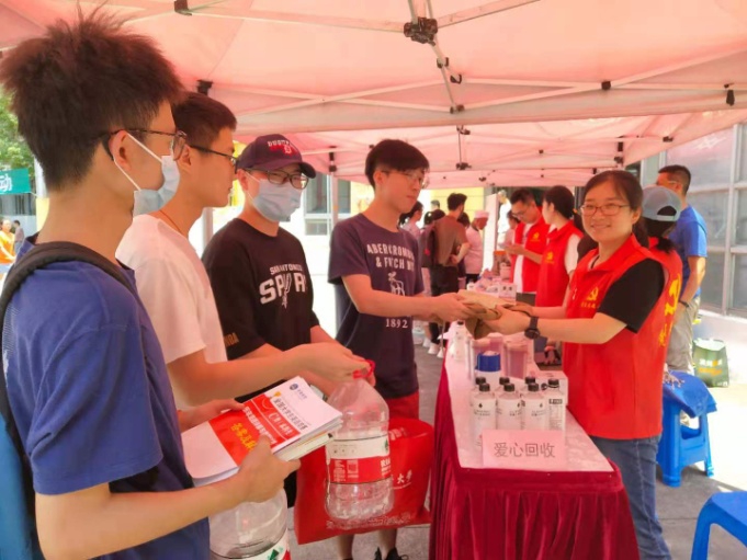 在6月24日活动现场特别设置的“爱心回收点”,毕业生们陆续带着各类纸箱、瓶罐、旧书、衣服等称重捐赠、兑换礼品。学生们纷纷表示,宿舍见证了他们在大学期间的成长,在离校时留下整洁的宿舍,可以为保洁阿姨们减轻一点工作量,也是为自己的大学时光划上了圆满句号。这不仅表达了毕业学子对母校的依恋和感激,体现了对曾经青葱岁月的怀念和不舍,更展现了新时代大学生的精神风貌。活动结束时,毕业生们捐赠的可回收物已堆满一车,支部党员们将把这些可回收物品进行分类整理,使资源得到有效利用,也让爱心不断传递下去。