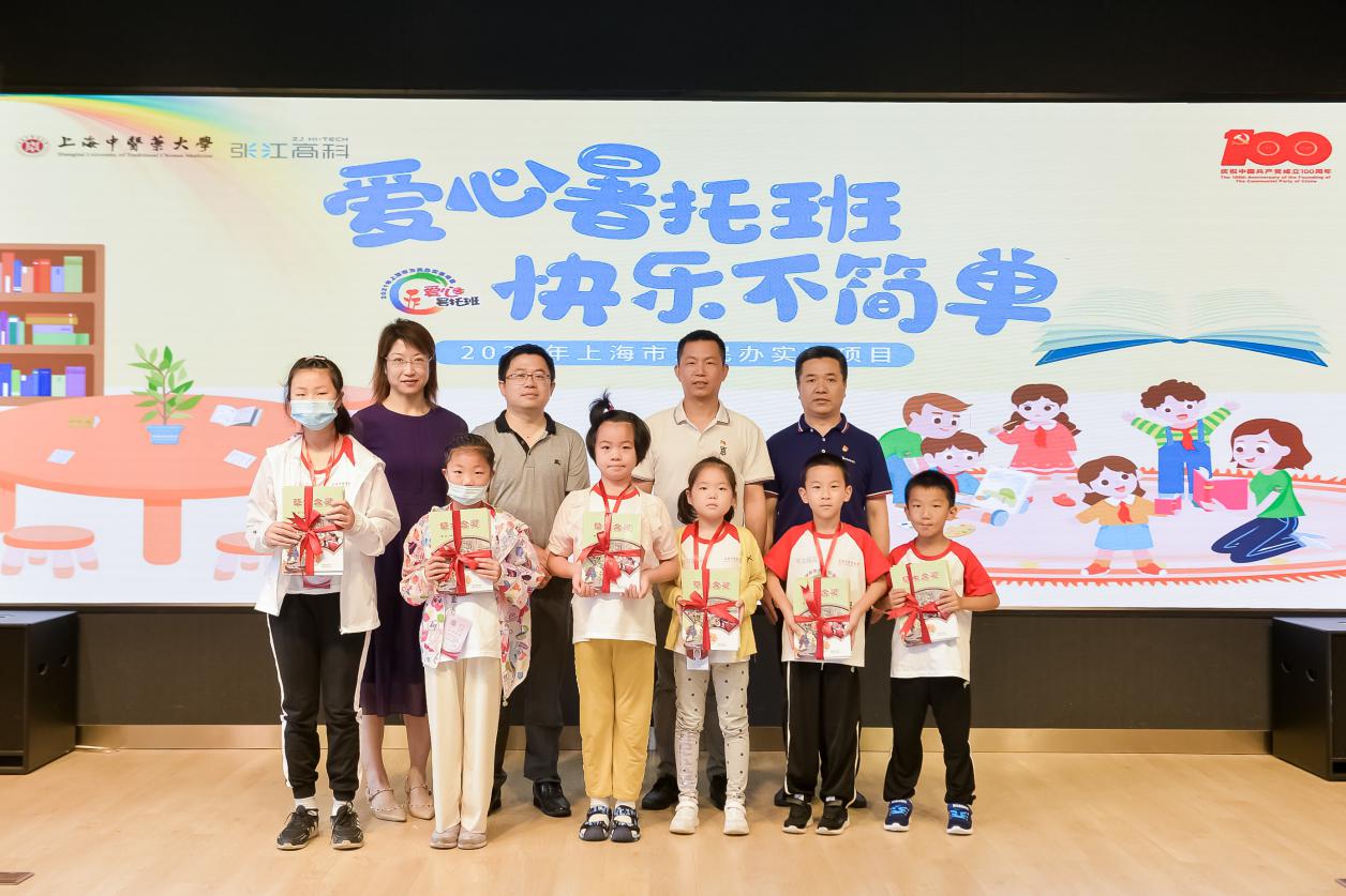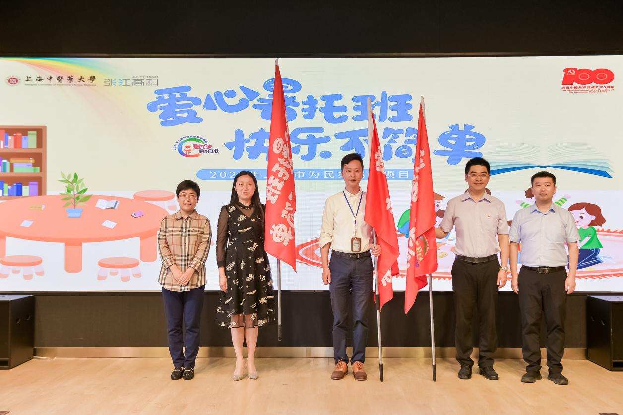 任浡和李慧向张江高科、sunbet申搏官方网站针灸推拿学院及康复医学院等承办单位授予爱心暑托班旗帜。